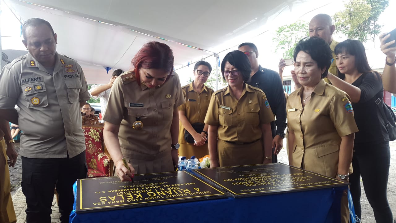 Bupati Vonnie Anneke Panambunan (VAP) didampingi Kapolres AKBP Alfaris Pattiwael SIK MH meresmikan ruang kantor dan 9 ruang belajar SMP 1 Airmadidi, Senin 28 Januari 2019 di Sarongsong Kecamatan Airmadidi.