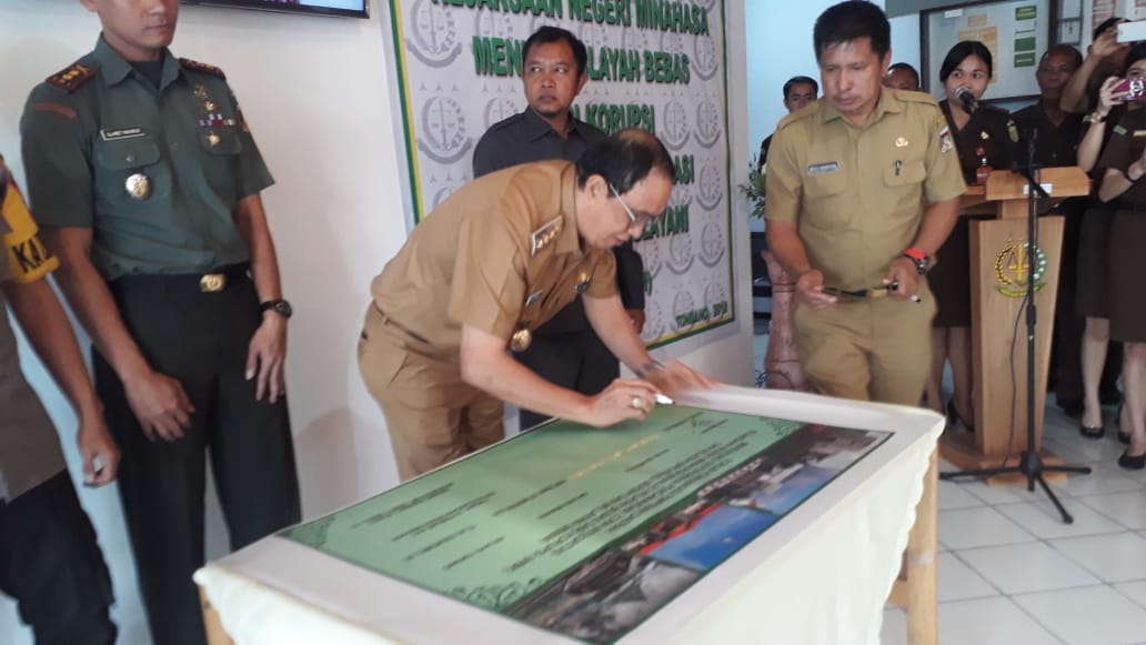 Pemerintah Kabupaten Minahasa melakukan Pencanangan dan Pembangunan Zona Integritas Kejaksaan Negeri Minahasa Menuju Wilayah Bebas Dari Korupsi dan Wilayah Birokrasi Bersih dan Melayani pada Senin (4/3/2019) di kantor Kejaksaan Negeri Minahasa.