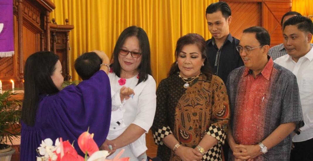 Bupati Minahasa Ir Royke Octavian Roring MSi didampingi isteri tercinta Dra Fenny Roring-Lumanauw SIP menghadiri ibadah baptisan anak Valino Wuwungan yang merupakan anak dari hukum tua desa Rambunan dalam keluarga Wuwungan-Sangkay yang bertempat di Gereja GMIM Sion Rambunan, Minggu (7/4/2019).