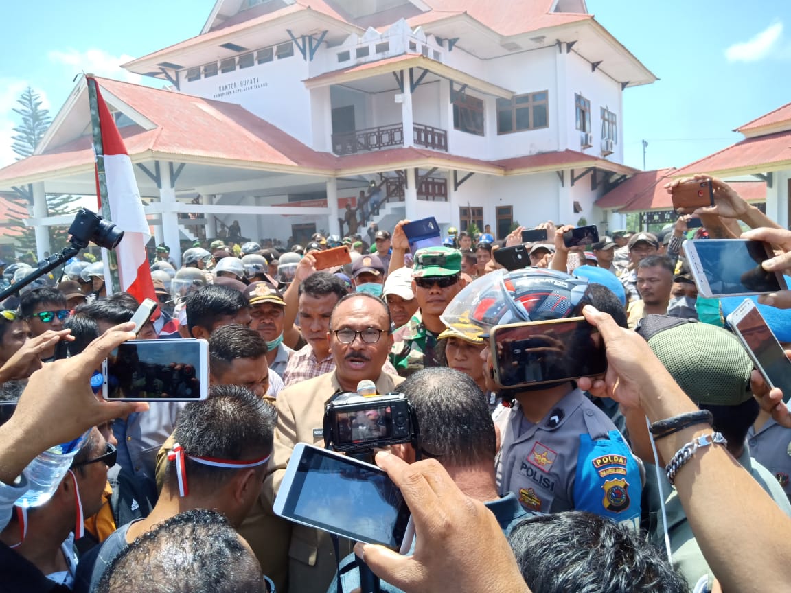 “Proses Pilkada Talaud telah selesai dan oleh Mahkamah Konstitusi E2L – Mantap ditetapkan sebagai pemenang, oleh karenanya kami mendesak kepada PLH untuk membuat surat yang ditujukan kepada Mendagri yang berisi tentang segera pelantikan diproses,” ujar Manaputty salah seorang kordinator aksi dalam orasinya di halaman kantor Bupati, Senin (13/8/2019).