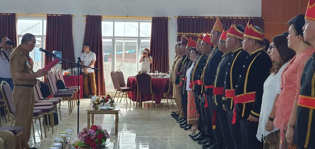 Bupati Minahasa, Ir. Royke Octavian Roring, M.Si disaksikan Gubernur Sulut, Olly Dondokambey, SE, melantik Pengurus DPC Apdesi Kabupaten Minahasa, di BPU Tondano, Senin (27/1/2020).