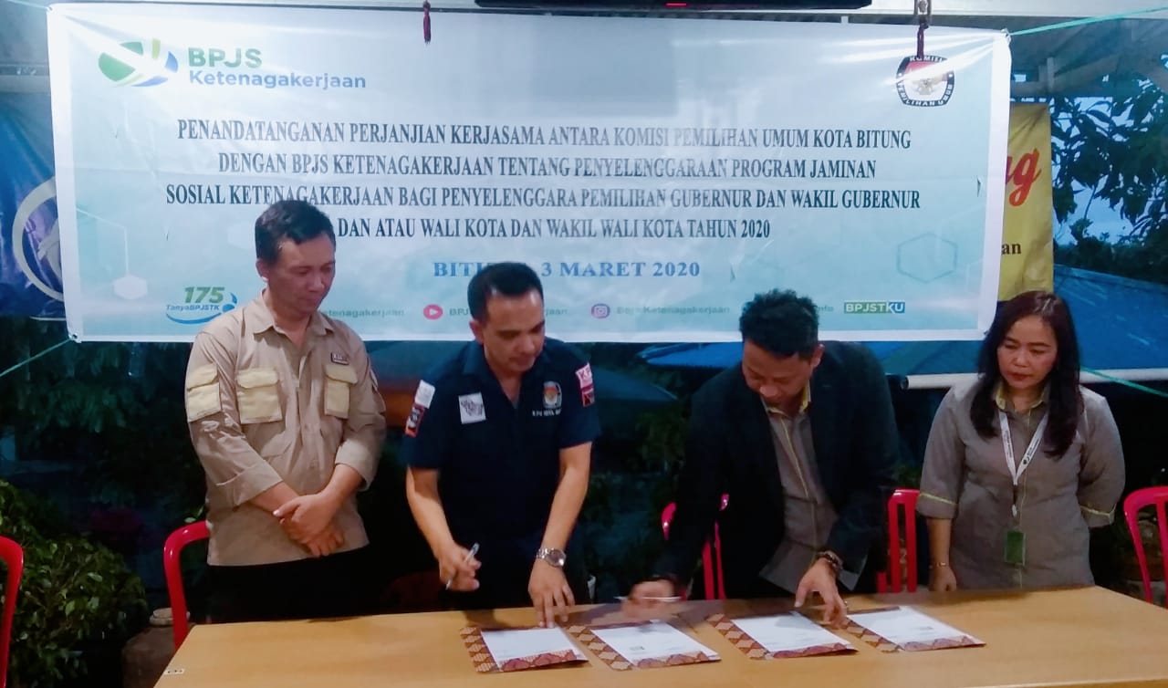 Tahapan diawali dengan penandatanganan MoU oleh Ketua KPU Kota Bitung Deslie Sumampouw dan Kepala Cabang BP Jamsostek Manado, Hendrayanto.