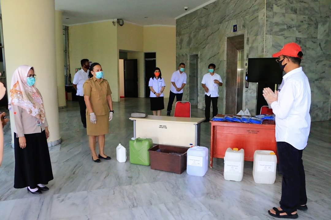 Bantuan APD ini berupa Face Mask buatan Fakultas Teknik (jurusan Mesin) dan Hand Sanitizer produksi Fakultas Matematika dan Ilmu Pengetahuan Alam (jurusan Fisika dan Kimia) Unsrat.