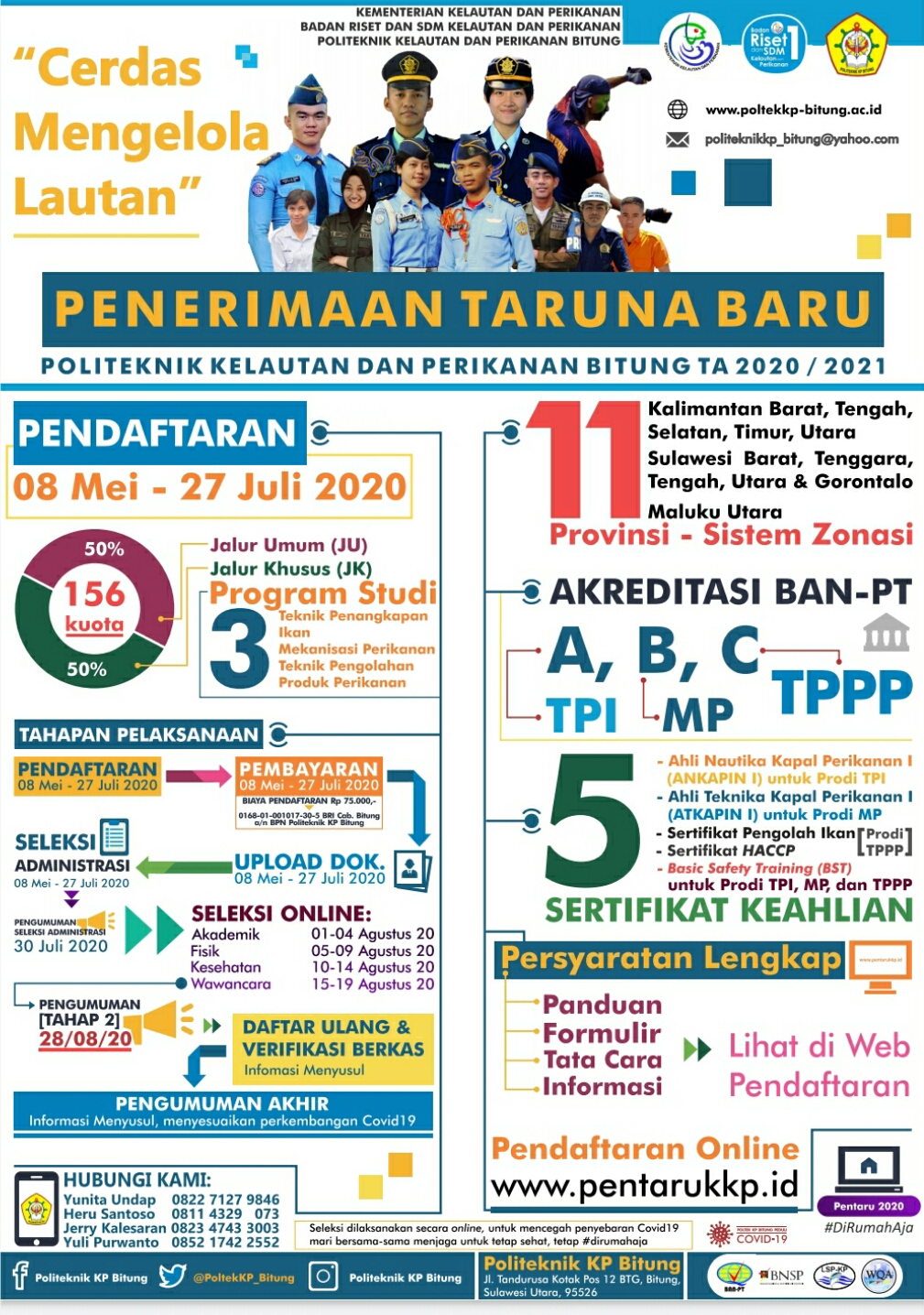 Dengan tahapan pelaksanaan yaitu pendaftaran 08-27 juli 2020 kemudian pembayaran 08-27 juli dengan biaya pendaftaran Rp 75.000 melalui rekening BRI Cabang Bitung no 0168-01-001017-30-5. Atas Nama BPN Politeknik KP Bitung.