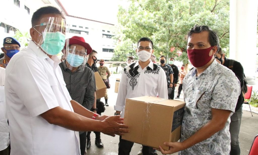 Manado, SULUTREVIEW – Gubernur Sulawesi Utara (Sulut), Olly Dondokambey menyalurkan 5000 paket Balasa (Bahan Pokok Lauk Pauk Siap Saji) dari Kemenparekraf kepada pelaku pariwisata yang terdampak pandemi Covid-19 di Lobi Kantor Gubernur, Sabtu (27/6/2020).