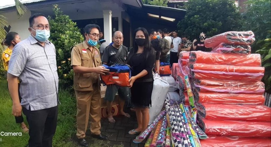 Nampak Kadis Sosial Rinny Tamuntuan dan Kaban BPBD Joy Oroh turun langsung menyerahkan bantuan berupa beras, mie instant, makanan siap saji, matras, tikar, selimut, paket sandang dan masker.