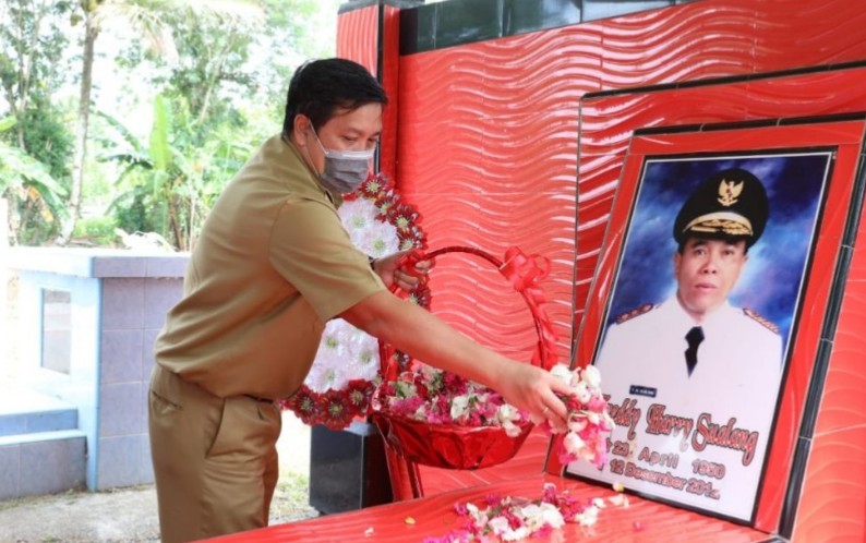 Wagub Kandouw bersama rombongan melakukan upacara penghormatan, mengheningkan cipta dan menabur bunga di makam Freddy Harry Sualang.