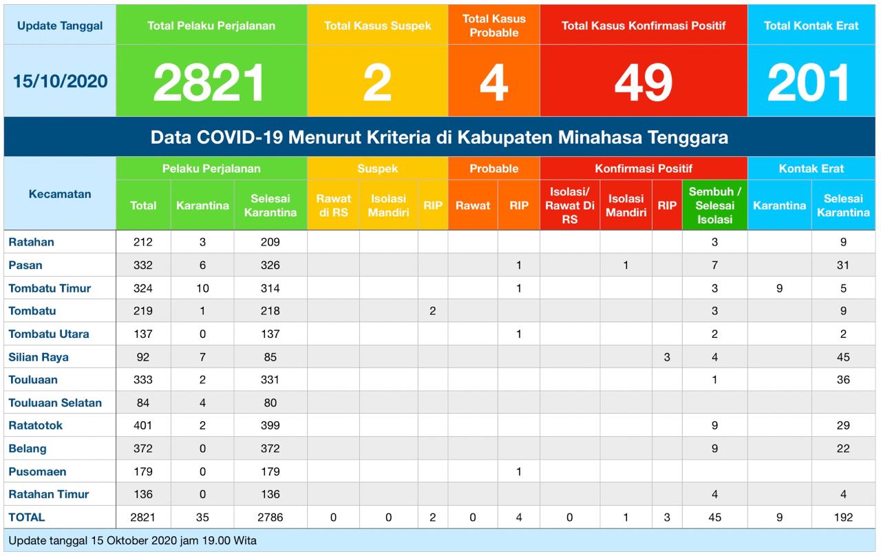 Hal ini disampaikan juru bicara satgas Covid-19 Mitra Gloria Wuwungan, Kamis (15/10/2020).