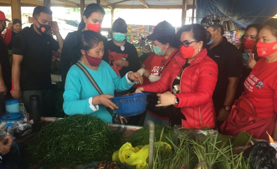 Istri Pasangan Calon Gubernur Sulawesi Utara (Sulut) Olly Dondokambey dan Wakil Gubernur Steven Kandouw yang sedang cuti itu, tak sekadar memantau aktivitas pasar tetapi juga ikut berbelanja berbagai kebutuhan seperti sayur-sayuran, ikan, pisang dan berbagai kue khas Manado seperti cucur dan apang ikut dibelanja.