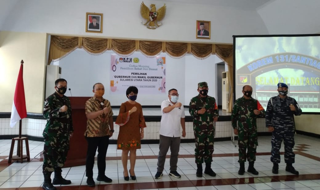 Manado, Sulutreview.com – Komisi Pemilihan Umum (KPU) Provinsi Sulawesi Utara bersama Korem 131/Santiago menggelar Coffee Morning bertema pembahasan Pemilihan Sehat dan Damai, di Aula Makorem 131/Santiago, Jumat (20/11/2020).