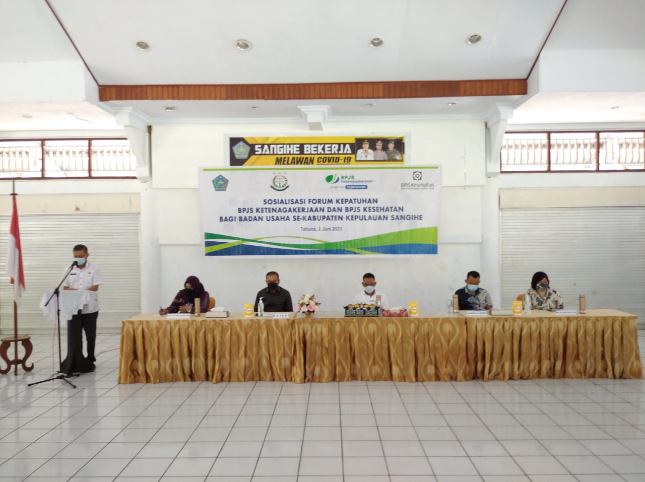 Kegiatan forum kepatuhan BPJS Ketenagakerjaan dan BPJS Kesehatan bagi seluruh Badan Usaha (BU), Jasa Konstruksi (Jakon) di wilayah Kepulauan Sangihe yang diselengggarakan oleh Pemda Sangihe lewat instansi terkait, yakni Dinas Tenaga Kerja (Disnaker) Daerah kepulauan Sangihe yang bekerja sama dengan Kejaksaan Negeri Kepulauan Sangihe.