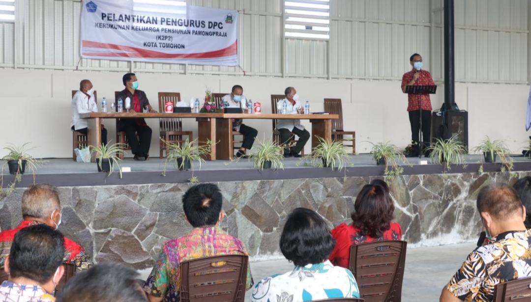 Tomohon, Sulutreview.com – Pengurus DPC (Dewan Pengurus Cabang) Kerukunan Keluarga Pensiunan Pamongpraja (K2P2) Kota Tomohon, bertempat di Terung Kabasaran Kediaman Wakil Walikota Tomohon, resmi dilantik, Jumat (04/06/2021).