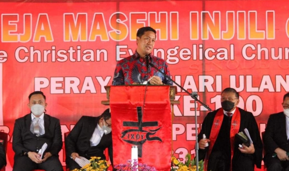 menghadiri ibadah syukur perayaan HUT PI dan Pendidikan Kristen ke-190 di Tanah Minahasa yang digelar di Kota Tomohon, Sabtu (12/6/2021)