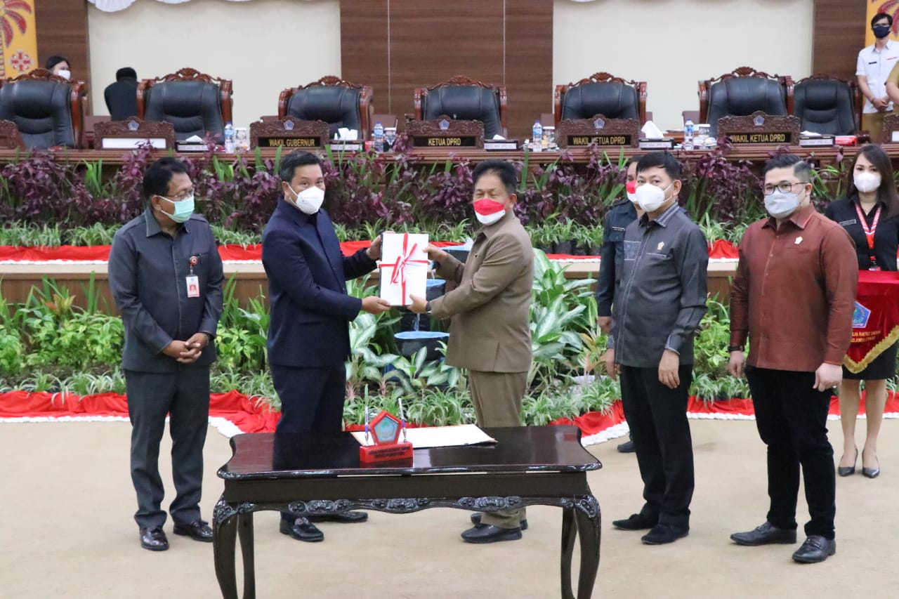 Rapat dilanjutkan dengan penandatanganan persetujuan bersama terhadap Ranperda RPJMD provinsi Sulut tahun 2021-2026 oleh Pimpinan DPRD Sulut dan Wakil Gubernur Sulut yang disaksikan seluruh anggota DPRD Provinsi Sulut, para assisten Pemerintah Provinsi Sulut bersama jajarannya, tokoh masyarakat, undangan dan insan pers yang hadir secara fisik maupun virtual. (Advertorial DPRD Sulut)