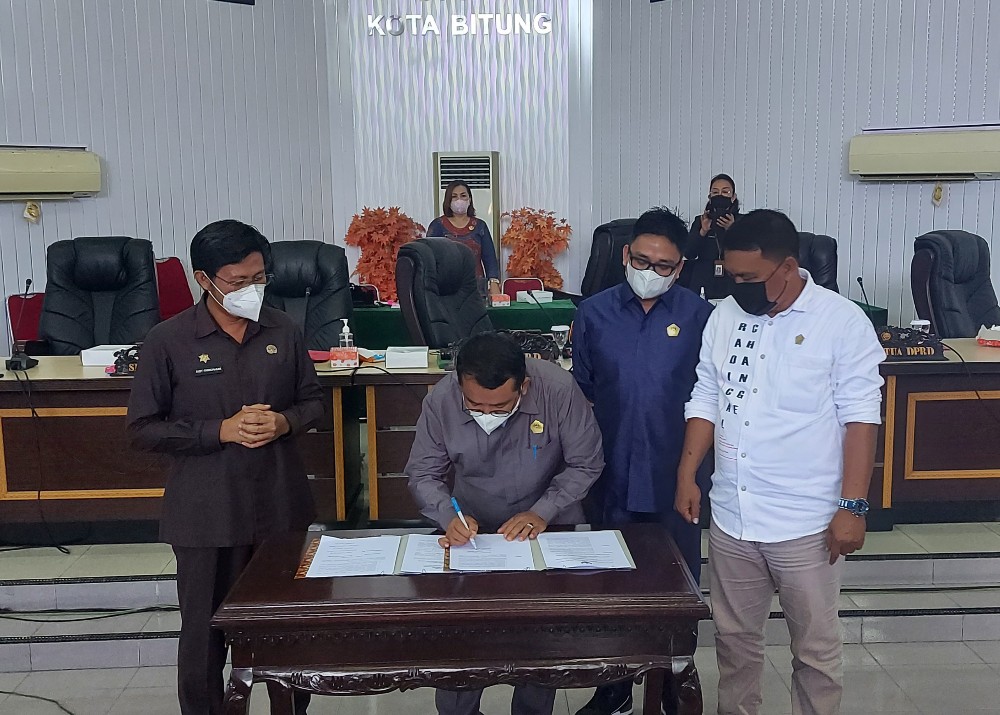 Bitung, Sulutreview.com– Setelah melalui pembahasan yang cukup panjang. Akhirnya usulan pihak eksekutif (Pemerintah Kota Bitung), terhadap 9 Rancangan Peraturan Daerah (Ranperda) sejak tahun 2020 kepada pihak Legislatif, akhirnya disetujui dan ditetapkan sebagai Peraturan Daerah (Perda) di tahun 2021 saat ini.