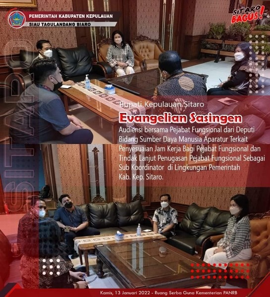 Disana Bupati Sitaro Evangelian Sasingen melakukan Audiensi bersama Pejabat Fungsional dari Deputi Bidang Sumber Daya Manusia Aparatur Terkait Penyesuaian Jam Kerja Bagi Pejabat Fungsional serta Tindak Lanjut Penugasan Pejabat Fungsional Sebagai Sub Koordinator di Lingkungan Pemerintah Kabupaten Kepulauan Sitaro.