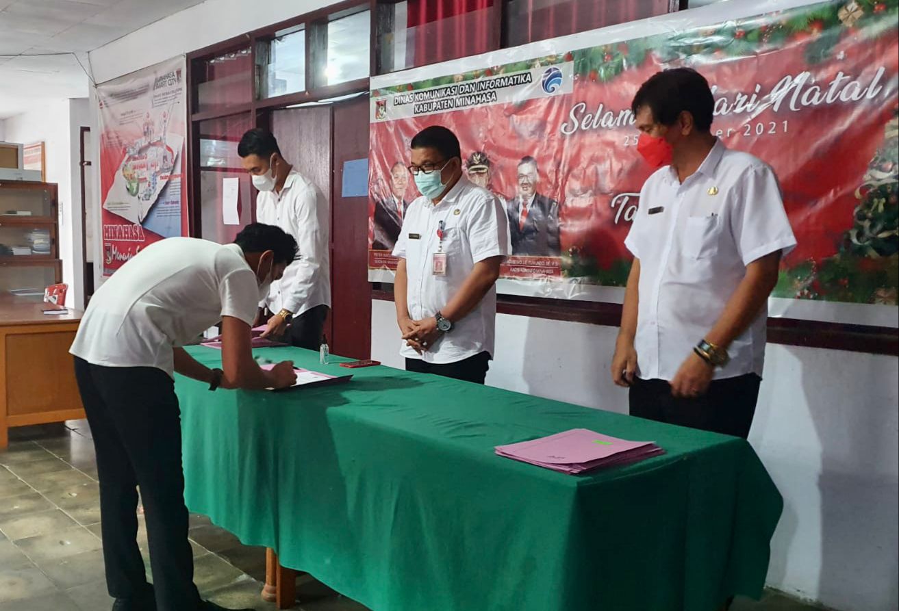 Tondano, Sulutreview.com – Sebagai bentuk komitmen untuk bekerja lebih baik dan berkualitas Aparatur Sipil Negara (ASN) di lingkup Dinas Komunikasi dan Informatika (Kominfo) Kabupaten Minahasa meneken Perjanjian Kinerja dan Pakta Integritas Rabu (09/02/2022).