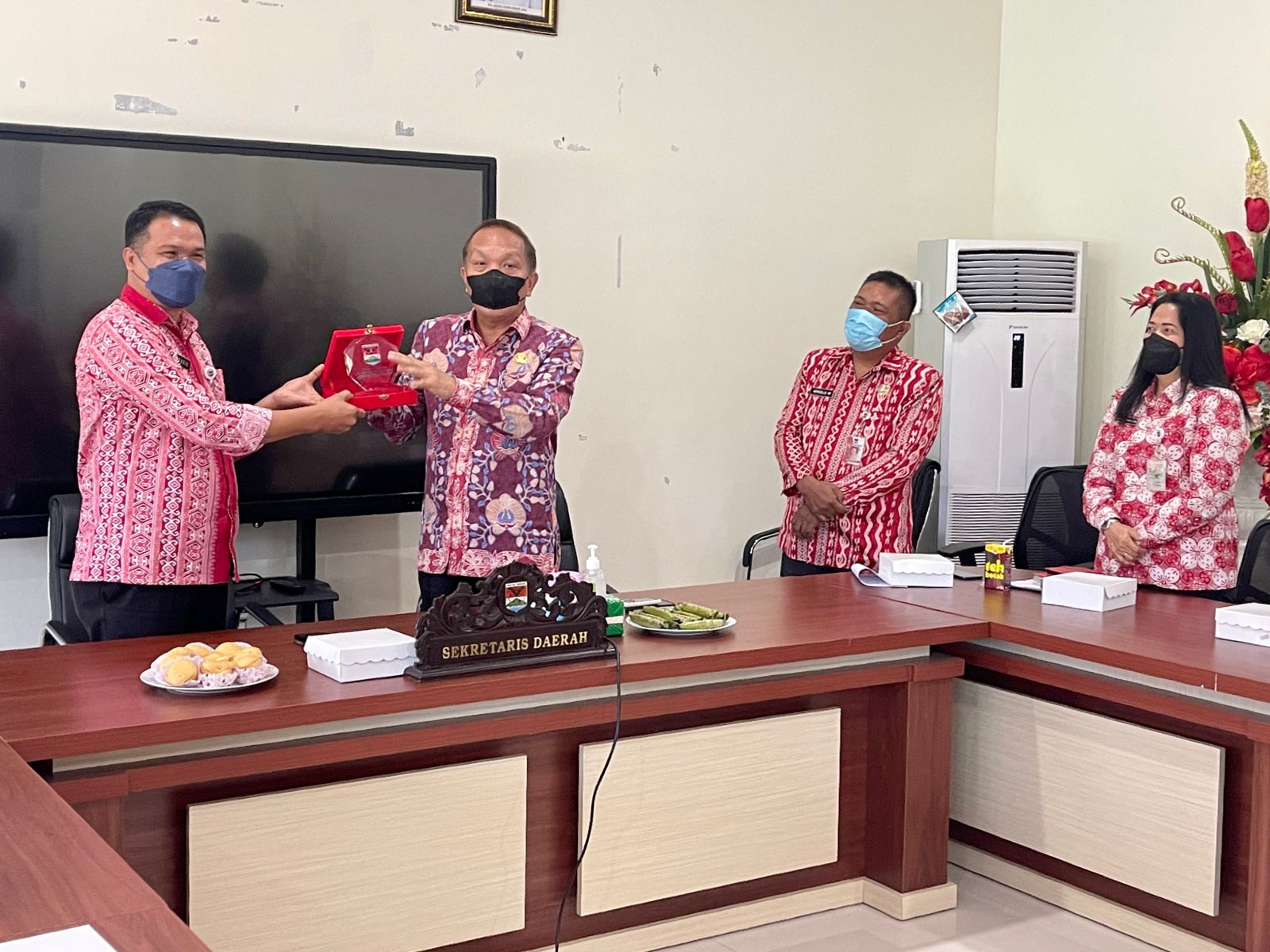 Sekdakab Frits Muntu yang didampingi oleh Inspektur Daerah Ir Alva Montong, Kepala Bapelitbangda Philep Siwi SE, Kepala BPKAD Joice Pua SE, Kepala Bapenda Dra Meita Aguw, Kepala BKPSDM Drs Moudy Pangerapan MAP, Kepala Dinas PMPTSP Mekry Sondey SE MSi, Kepala Dinas KOMINFO Agustivo Tumundo SE MSi, Staf Ahli Bupati Drs Teddy Sumual, Kabag PBJ Daudson Rombon ST, Kabag Prokopim Johnny Tendean AP MAP dan para pejabat terkait lainnya ini diterima langsung oleh Sekretaris Daerah Kabupaten MITRA David Lalandos AP MM dan jajarannya.(engel)