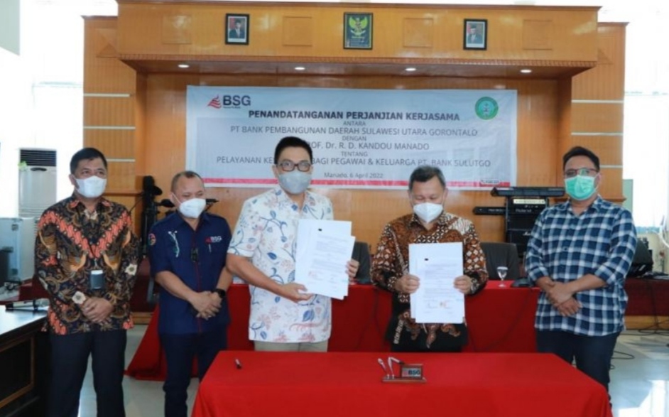 Manado, Sulutreview.com – PT Bank Pembangunan Daerah Sulawesi Utara dan Gorontalo (BSG) dan RSUP Prof Dr RD Kandou Manado teken kerja sama jaminan pelayanan kesehatan bagi pegawai dan keluarga yang digelar di aula BSG Pusat Manado, Rabu (4/4/2022).