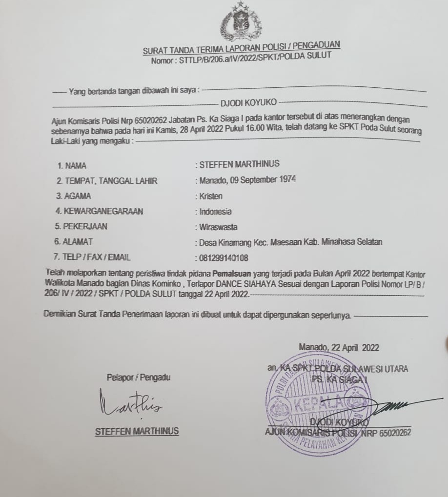 Laporan ke Polda Sulut ini, berdasarkan surat tanda terima laporan polisi/pengaduan (STTLP) yang ditandatangani oleh AKP. Djodi Koyuko jabatan Ps. KA Siaga I, An KA SPKT. Polda Sulut tanggal 28 April 2022.(srv)