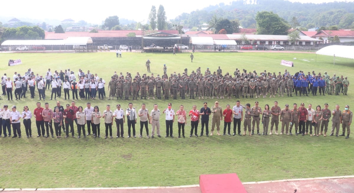 Tomohon, Sulutreview.com – Menjelang event Hari Persatuan (Hapsa) Pria/Kaum Bapa (PKB) Sinode GMIM 2022, Pemerintah Kota Tomohon melaksanakan apel gelar pasukan secara terpadu sebagai bentuk pengecekan kesiapan untuk pengamanan di Stadion Babe Palar Tomohon, Kamis (9/6/2022).