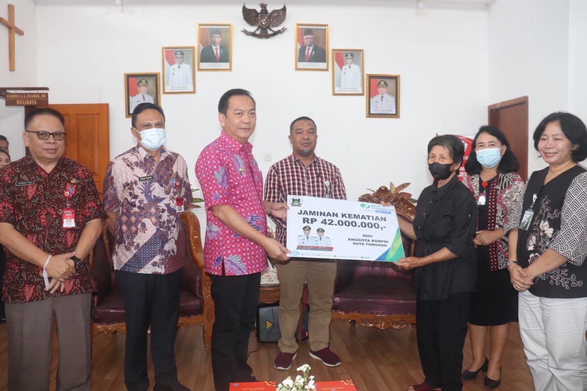 menyerahkan santunan kematian, melalui Program Peduli Kasih yang diserahkan kepada ahli waris pekerja rentan sebanyak 5 orang, dan ahli waris Korpri 2 orang di ruang pertemuan Walikota Tomohon Jumat (1/7) 2022).