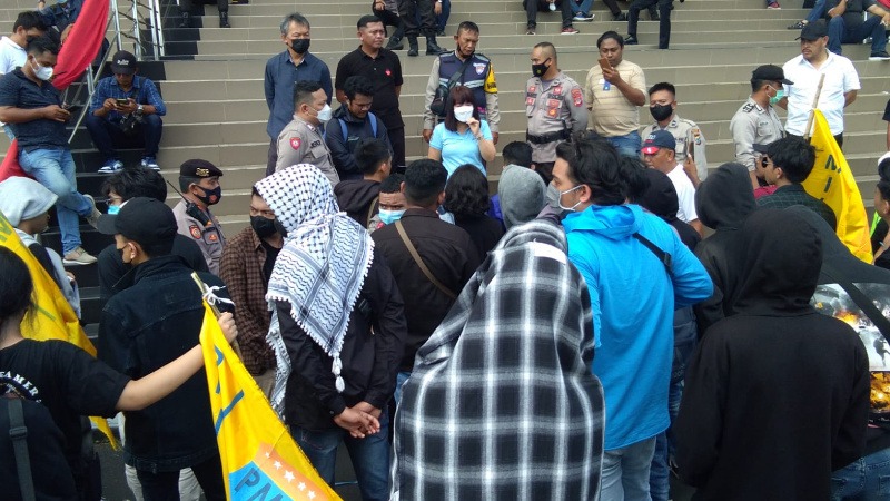 “Kami telah menyediakan tempat untuk menyampaikan aspirasi dan terkait seorang mahasiswa yang ditahan oleh pihak kepolisian diinformasikan bahwa yang bersangkutan membawa ban sepeda motor dan BBM, serta sudah dalam pengaruh minuman keras. Biarlah diperiksa terlebih dahulu oleh pihak berwajib, namun aspirasi adik-adik mahasiswa kami akan terima dan diskusikan di dalam ruangan,” ungkap Glady.
