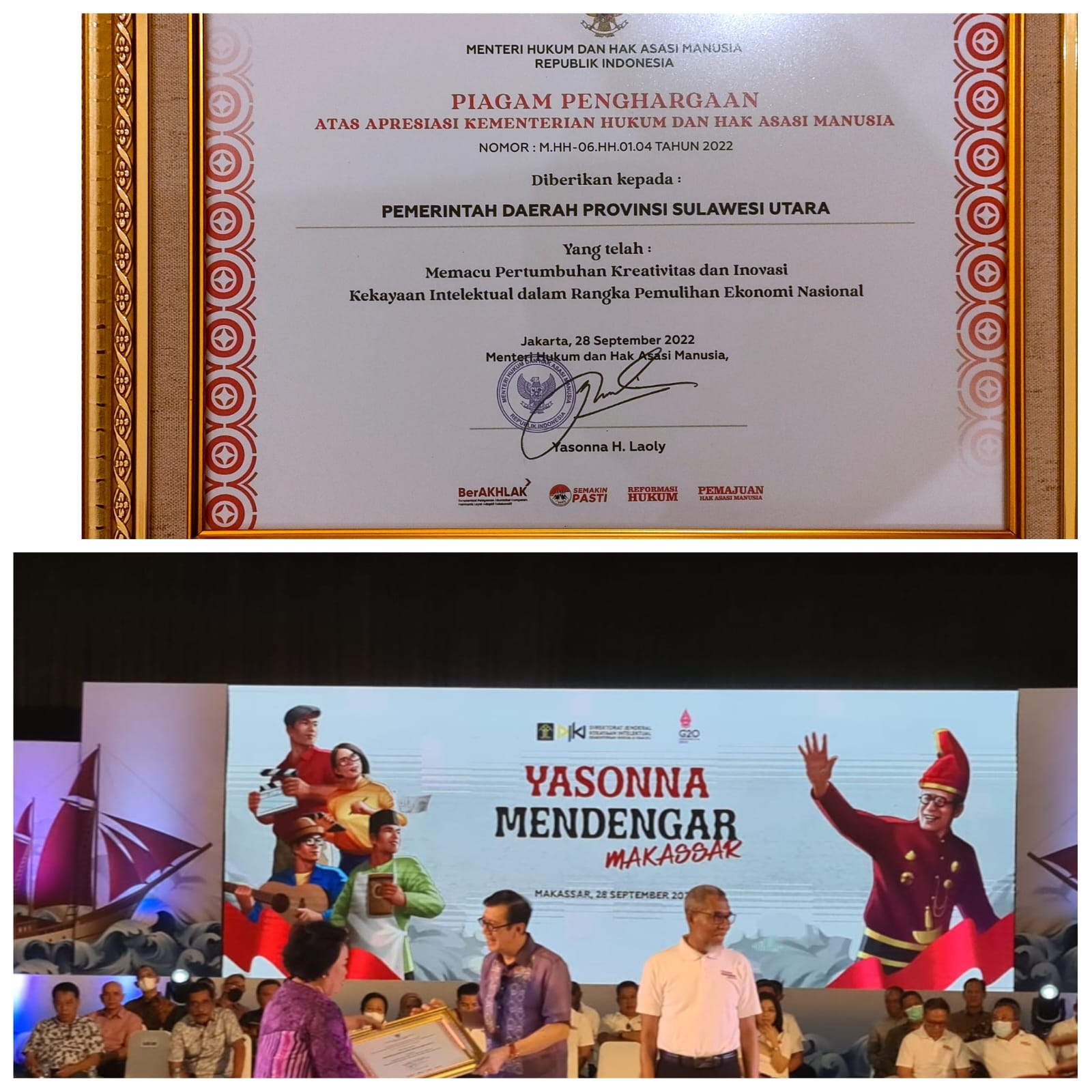 Penghargaan diserahkan Menkumham Yasonna H Laoly melalui momentum yang bertajuk ‘Yasonna Mendengar’ kepada Gubernur Olly Dondokambey yang diwakili Kepala Biro Hukum Setda Provinsi Sulawesi Utara Flora Krisen di Universitas Negeri Makassar (UNM), Rabu (28/09/2022).