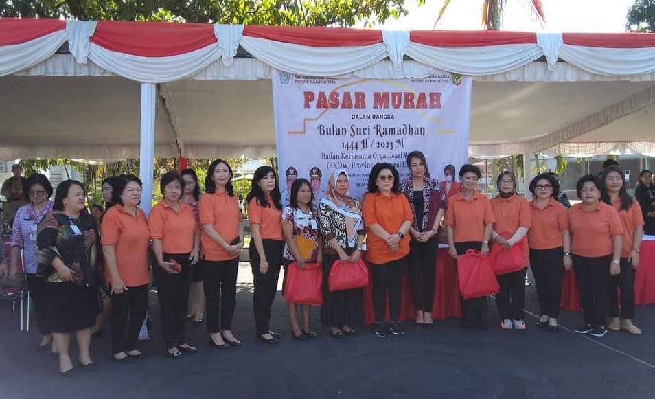 Manado, Sulutreview.com – Badan Kerjasama Organisasi Wanita Provinsi Sulawesi Utara (BKOW Sulut) menyediakan pasar murah di halaman belakang Kantor Gubernur Sulut, Kamis (13/04/2023).