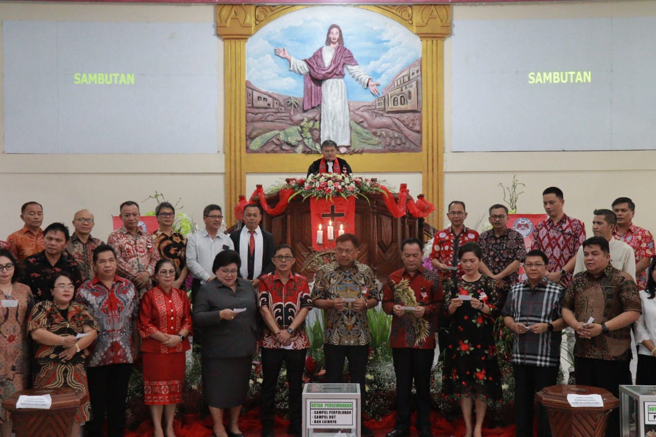 Hadir memimpin ibadah, Ketua BPMS GMIM Pdt Hein Arina serta Wali Kota Tomohon, Caroll Senduk, Rektor Unsrat Oktovian Berty Sompie, jajaran pejabat eselon II Pemprov Sulut dan jemaat.(eda)