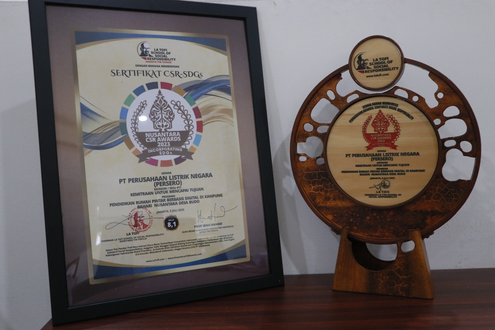 Penghargaan tersebut diserahkan langsung oleh La Tofi selaku Chairman The La Tofi School of Social Responsibility yang juga Ketua Tim Penilai Nusantara CSR Awards 2023 dan diterima oleh Vice President TJSL PT PLN (Persero), Agus Yuswanta. Penghargaan yang diberikan masuk dalam kategori Sustainable Development Goals (SDG’s) ‘Kemitraan Mencapai Tujuan’ dengan Program ‘Pendidikan Rumah Pintar Berbasis Digital di Kampung Bahari Nusantara Desa Budo’.