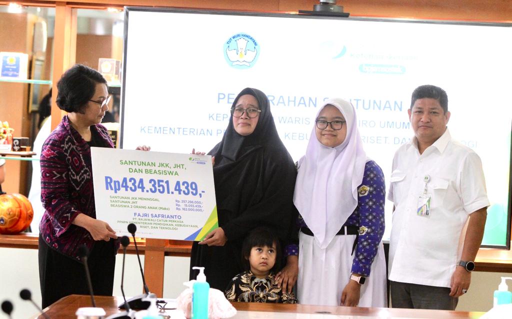 “Kami hadir menyerahkan santunan kepada ahli waris dari peserta BPJS Ketenagakerjaan yang terdaftar pada PPNPN Biro Umum Kemendikbudristek, ahli waris mendapatkan jaminan sosial berupa santunan program JKK meninggal dunia, JHT serta manfaat beasiswa pendidikan anak hingga sarjana. Ini tugas kami BPJS Ketenagakerjaan untuk memastikan keluarga dari peserta mendapatkan haknya,” jelas Zainudin.