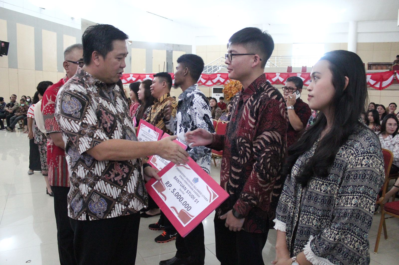 Penyerahan bantuan beasiswa dihadiri Sekretaris Daerah Provinsi (Sekprov) Steve Kepel, Asisten 2 Setdaprov Denny Mangala, Asisten 3 Setdaprov Franky Maumpil, Kepala BKAD Clay Dondokambey beserta para orang tua mahasiswa.(eda)