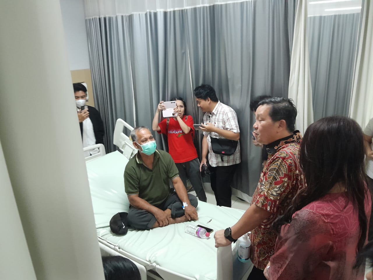 Kandouw yang berkesempatan meninjau perawatan pasien pengungsi bencana Gunung Ruang menanyakan kondisi mereka sembari memberi semangat dan menyerahkan bingkisan.