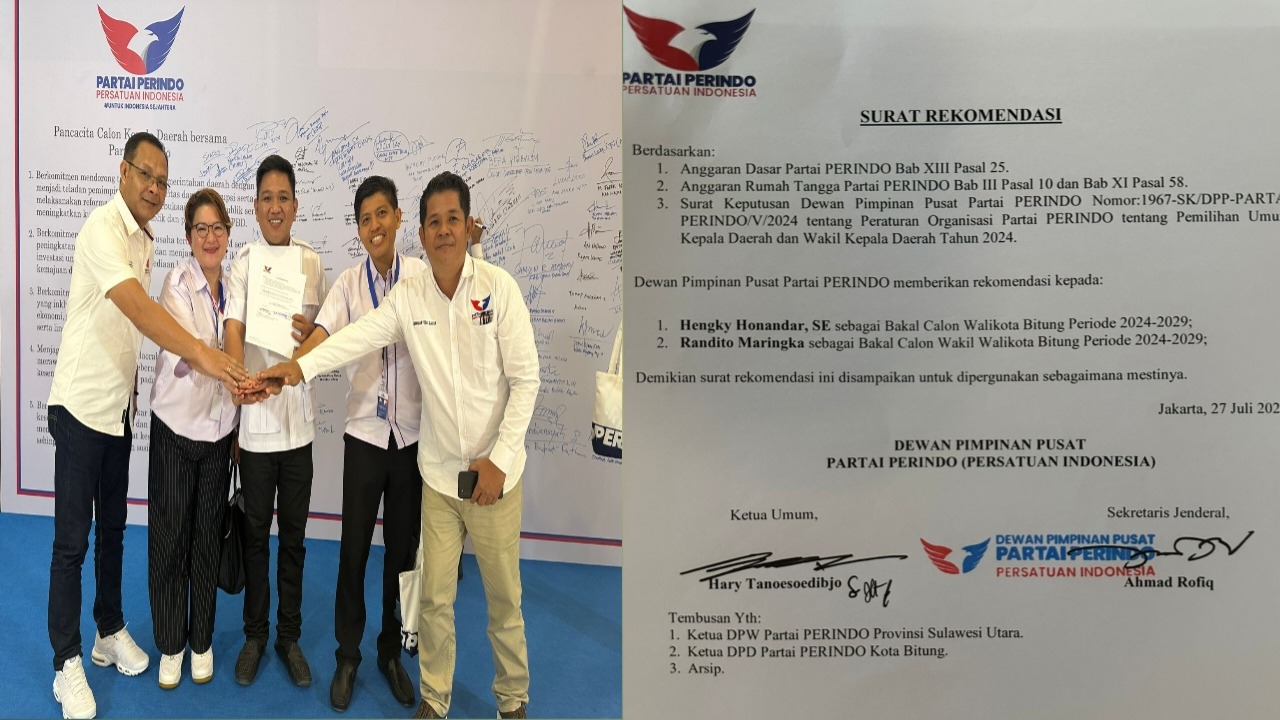 Kabar terbaru Bacalon HH-RM, telah resmi mendapatkan Surat Rekomendasi dari Dewan Pimpinan Pusat (DPP) Partai Perindo sebagai Bakal Calon Wali Kota Bitung dan Wakil Wali Kota Bitung kepada. HH-RM.