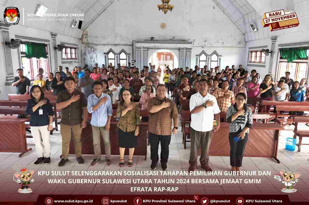 Manado, Sulutreview.com – KPU Sulut menyelenggarakan kegiatan sosialisasi tahapan pemilihan Gubernur dan Wakil Gubernur Sulawesi Utara tahun 2024 bersama Jemaat GMIM Efrata Rap-Rap.