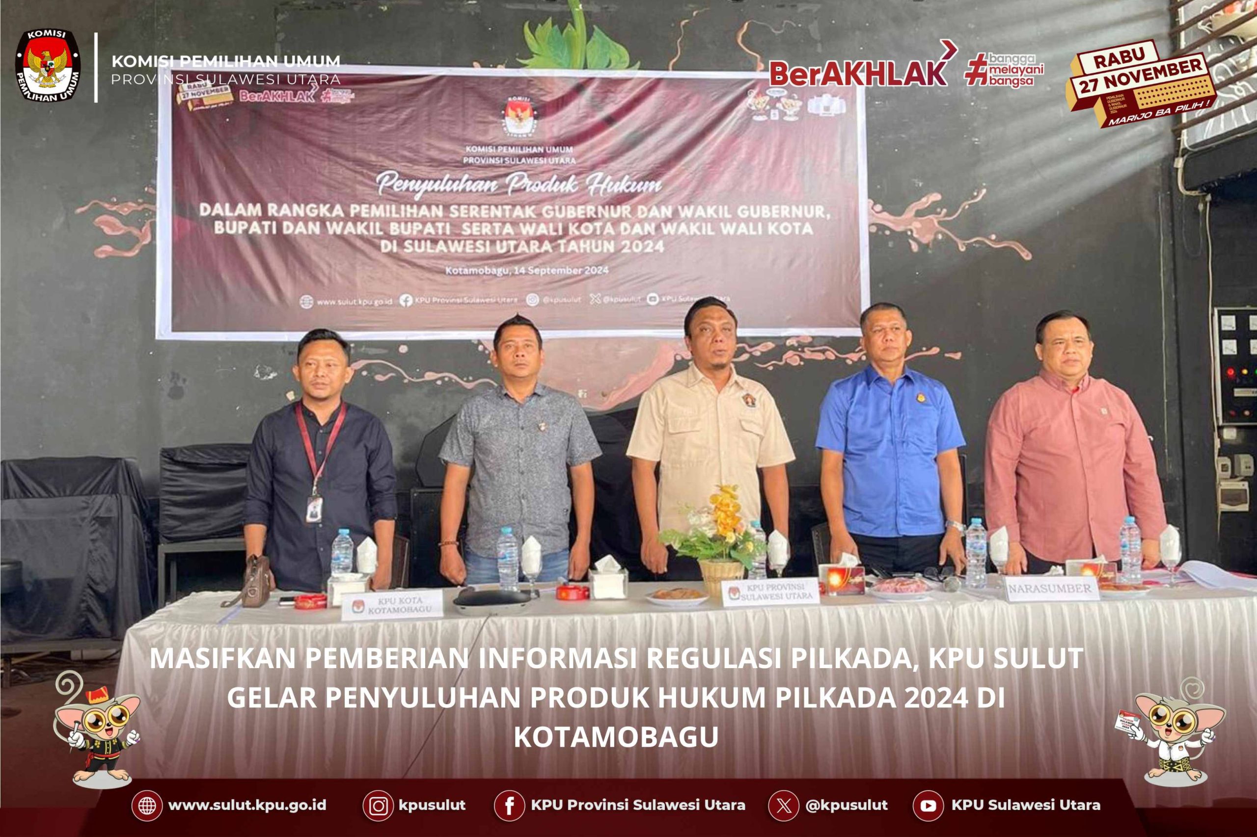Manado, Sulutreview.com – Dalam rangka memasifkan pemberian informasi regulasi terkait dengan Pilkada 2024, KPU Sulut secara intensif melaksanakan Penyuluhan Produk Hukum dalam rangka Pemilihan Serentak Gubernur dan Wakil Gubernur, Bupati dan Wakil Bupati serta Walikota dan Wakil Walikota di Sulawesi Utara Tahun 2024, kali ini dilaksanakan di Cafe & Resto Stawberry Kota Kotamobagu pada hari Sabtu, 14 September 2024.