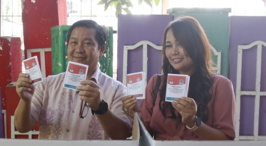 Steven Kandouw tiba di TPS sekira pukul 08.30, bersama istri tercinta dr Kartika Devi Kandouw Tanos, Rabu (27/11/2024).