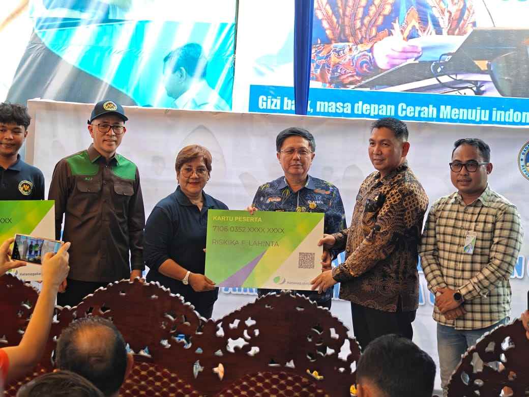 Minut, Sulutreview.com – Badan Penyelenggara Jaminan Sosial Ketenagakerjaan (BPJamsostek) Sulawesi Utara menyerahkan kartu kepesertaan kepada 54 relawan Satuan Pelayanan Pemenuhan Gizi (SPPG) Airmadidi, Jumat (13/6/2025).
