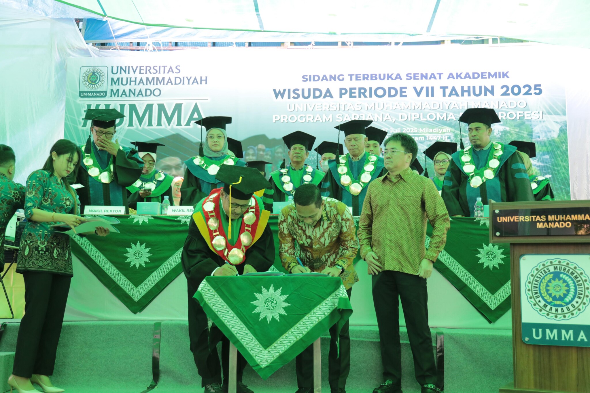 Penandatanganan yang disaksikan langsung oleh Wakil Menteri Pendidikan Tinggi, Sains, dan Teknologi Republik Indonesia, Prof. Dr. Fauzan, M.Pd ini, berlangsung dalam rangkaian kegiatan Wisuda Periode VII Universitas Muhammadiyah Manado Tahun 2025, untuk jenjang Sarjana, Diploma, dan Profesi.