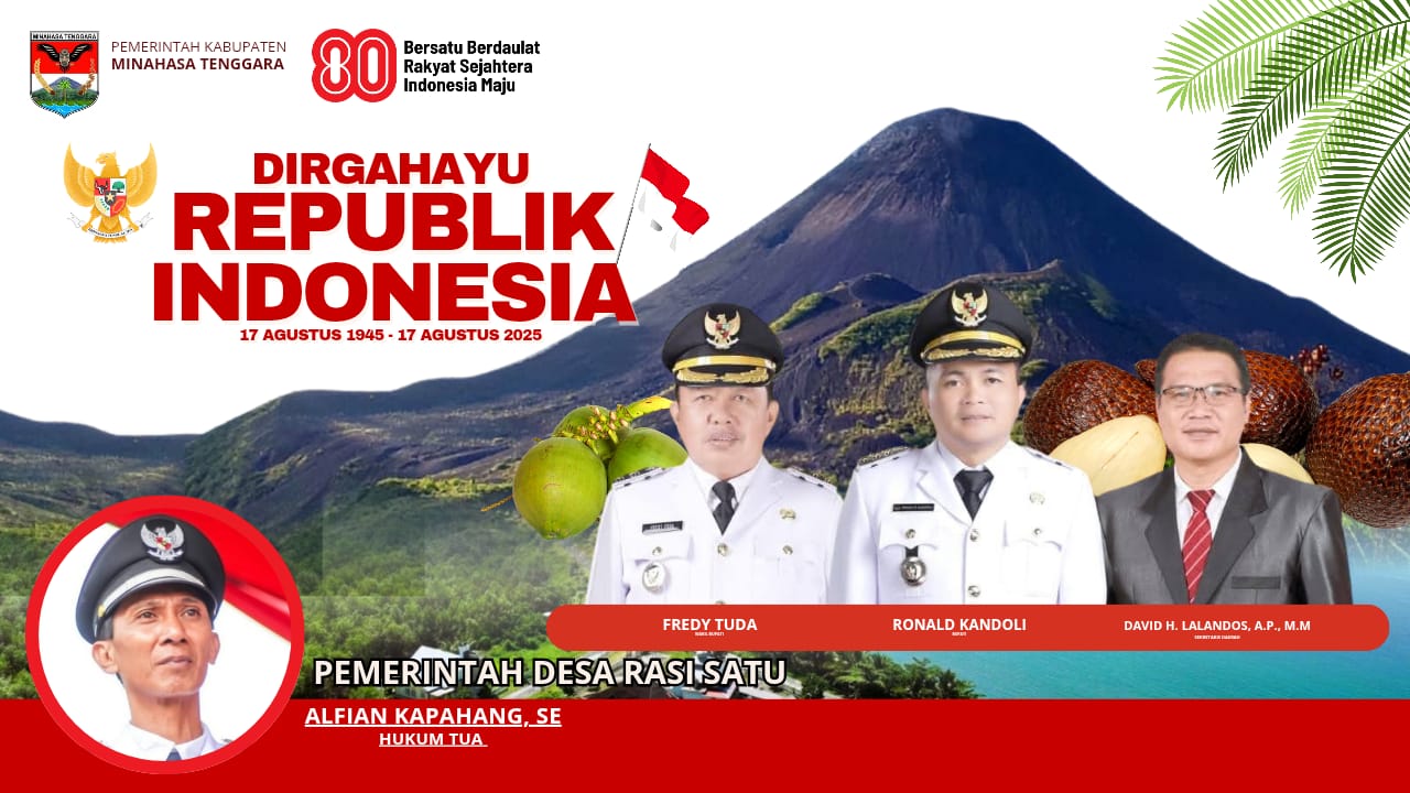 Pemerintah Desa Rasi Satu, Kecamatan Ratahan, Kabupaten Minahasa Tenggara, yang dipimpin oleh Hukum Tua Alfian Kapahang SE, mengucapkan selamat memperingati Hari Ulang Tahun Republik Indonesia yang ke-80 pada 17 Agustus tahun 2025.
