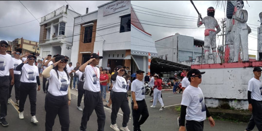 Mereka berjalan dengan langkah seirama, meskipun cuaca yang sedikit panas, semangat mereka tidak surut; setiap langkah yang diambil adalah bentuk penghormatan terhadap perjuangan nenek moyang dan komitmen untuk memajukan Desa Rasi Satu sebagai bagian dari Indonesia.
