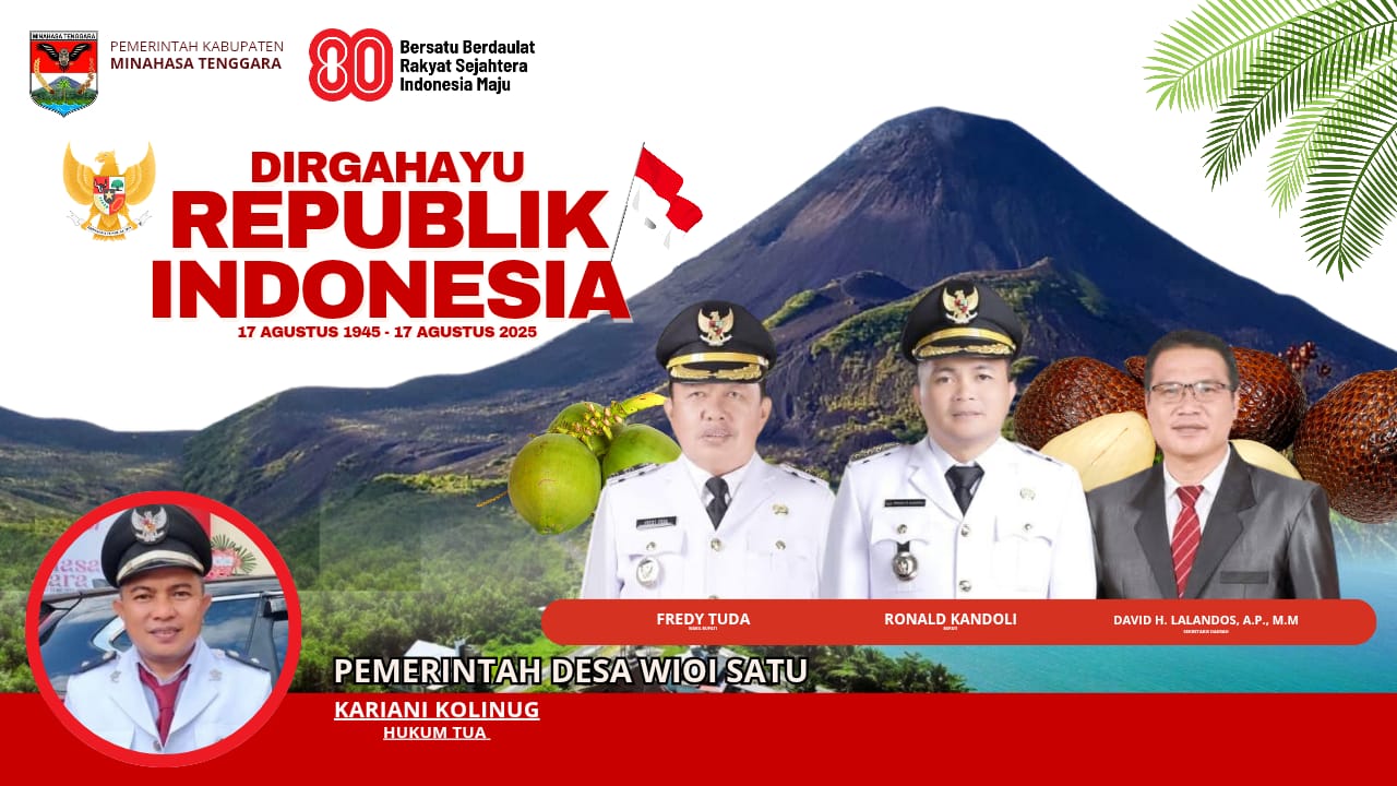 Pemerintah Desa Wioi Satu, Kabupaten Minahasa Tenggara, melalui Hukum Tua Kariani Kolinug, menyampaikan ucapan Selamat Hari Ulang Tahun Republik Indonesia yang ke-80 pada 17 Agustus tahun 2025.