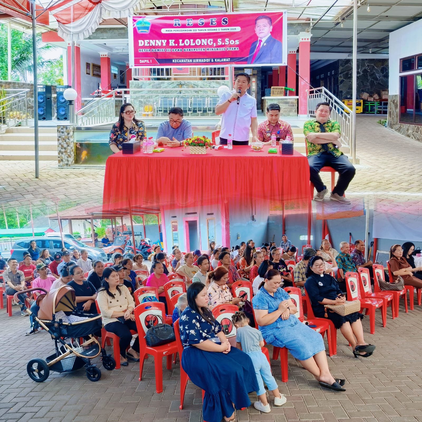 Minut, Sulutreview.com – Ketua Komisi III DPRD Kabupaten Minahasa Utara (Minut) dari Fraksi PDI Perjuangan Denny Kamlon Lolong menggelar reses di Daerah Pemilihan (Dapil) I Kecamatan Airmadidi dan Kalawat yang berlangsung di Desa Suwaan Kecamatan Kalawat Kabupaten Minut, kamis (28/8/2025).