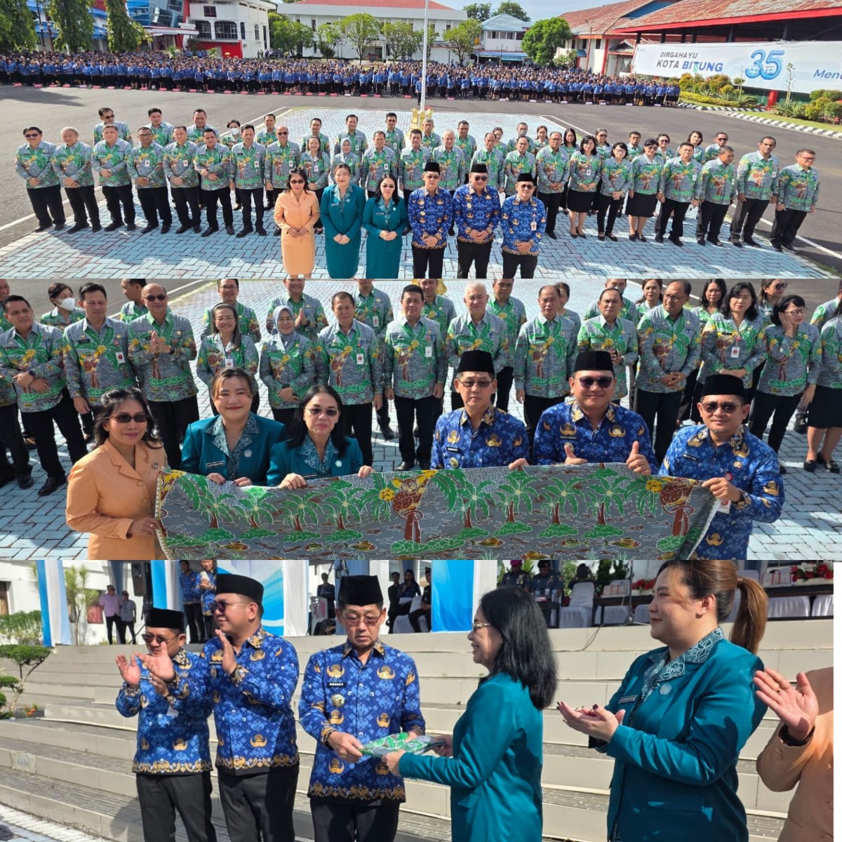 Dalam sesi simbolis, Ellen Honandar menyerahkan kain Batik Harmoni kepada Wali Kota Bitung Hengky Honandar, SE sebagai tanda dimulainya penggunaan resmi batik tersebut oleh seluruh ASN.