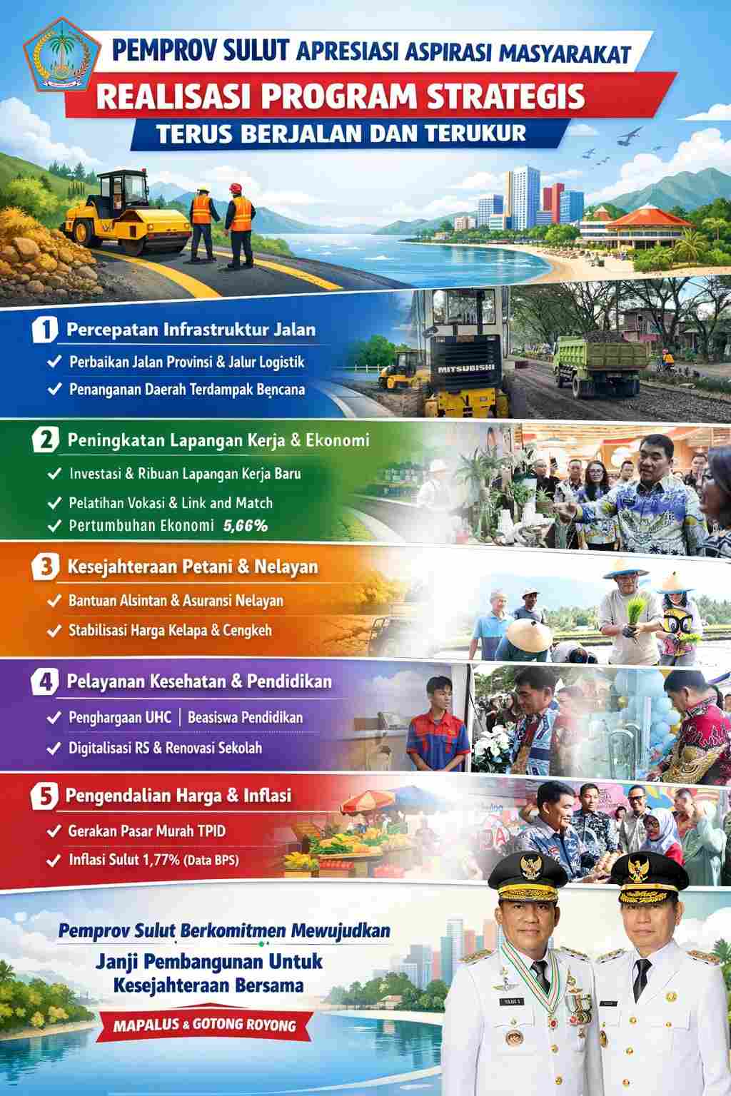 Pemerintah Provinsi Sulawesi Utara berkomitmen penuh untuk mewujudkan seluruh janji pembangunan menjadi realitas yang dirasakan langsung. Semangat Mapalus dan gotong royong antara pemerintah dan masyarakat menjadi kunci utama dalam menjaga momentum pertumbuhan positif ini.(hilda/*)